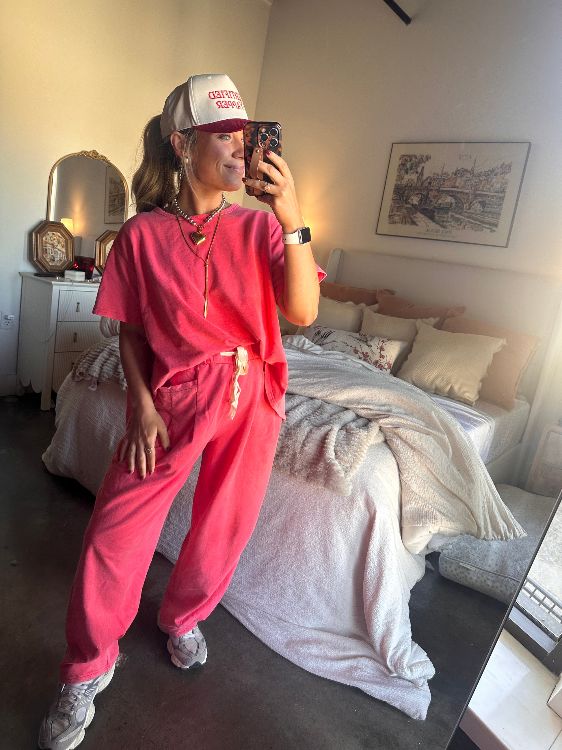 This two-piece cotton set features a hi-low relaxed tee with subtle back pleats and wide-leg drawstring pants with oversized pockets. A boutique-worthy essential for elevated lounge styling, it balances comfort with polish - perfect for curated casualwear that transitions seamlessly from home to street. 100%COTTON